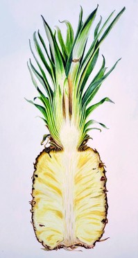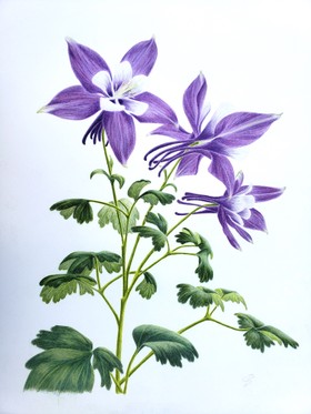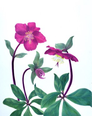 Artworks: Hellebore Helleborus, Pineapple Ananas comosus, Columbine Aquilegis. Coloured pencil on paper.